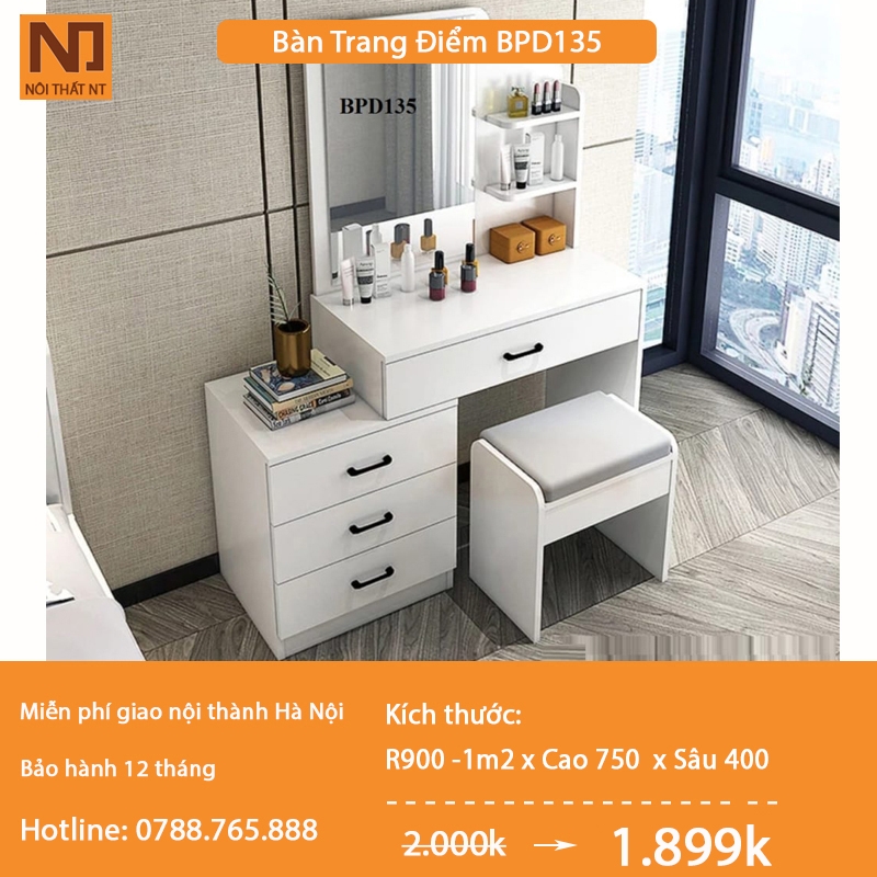 Đồ gỗ nội thất NT chuyên thiết kế, sản xuất và cung cấp các mẫu bàn trang điểm, bàn phấn đẹp, hiện đại, mẫu mã đa dạng, có thể đặt làm kích thước theo yêu cầu. Sau đây là mẫu Bàn trang điểm BPD135