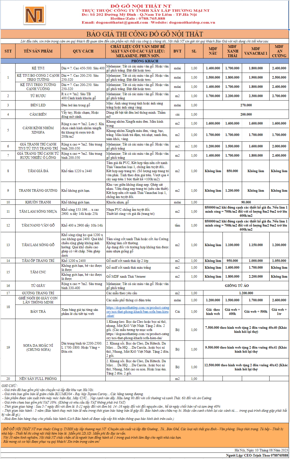 BÁO GIÁ ĐỒ GỖ NỘI THẤT