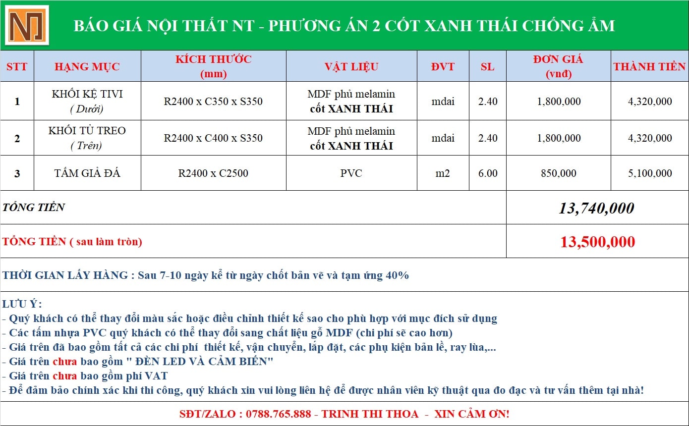 Sau khi thực hiện ốp vách kệ tivi xong, nhân viên Nội Thất NT tiến hành kiểm tra lại một lần nữa. Nếu không có sai xót gì, nhận thanh toán của khách hàng và tư vấn về chính sách bảo hành nếu khách hàng yêu cầu.