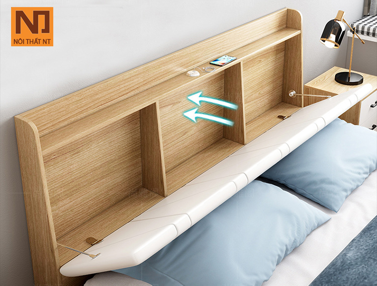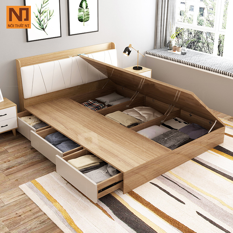 Thiết kế giường 3 ngăn kéo, 3 ngăn lật, đệm đầu giường, thang chạm đất, lực dồn xuống đất rất chắc chắn và bền bỉ.