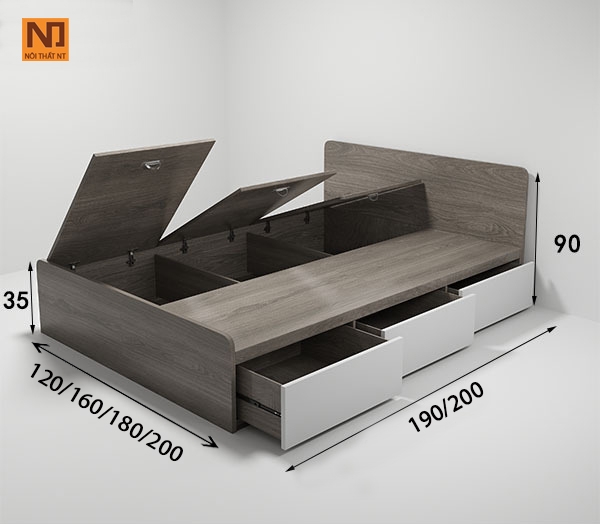 Thiết kế giường 3 ngăn kéo, 3 ngăn lật, đệm đầu giường, thang chạm đất, lực dồn xuống đất rất chắc chắn và bền bỉ.