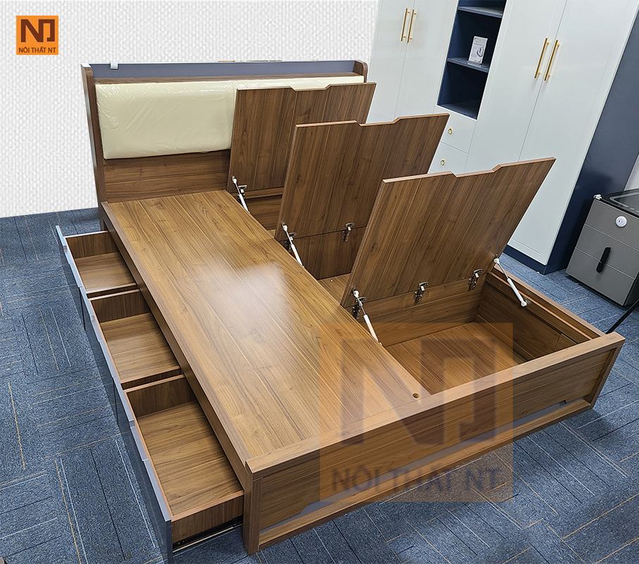 Thiết kế giường 3 ngăn kéo, 3 ngăn lật, đệm đầu giường, thang chạm đất, lực dồn xuống đất rất chắc chắn và bền bỉ.