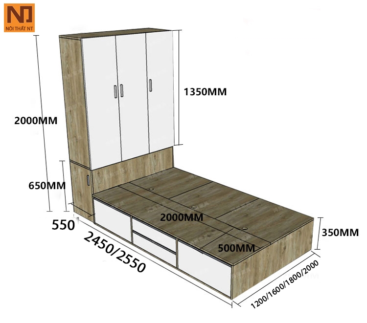 Thiết kế giường 3 ngăn kéo, 3 ngăn lật, đệm đầu giường, thang chạm đất, lực dồn xuống đất rất chắc chắn và bền bỉ.