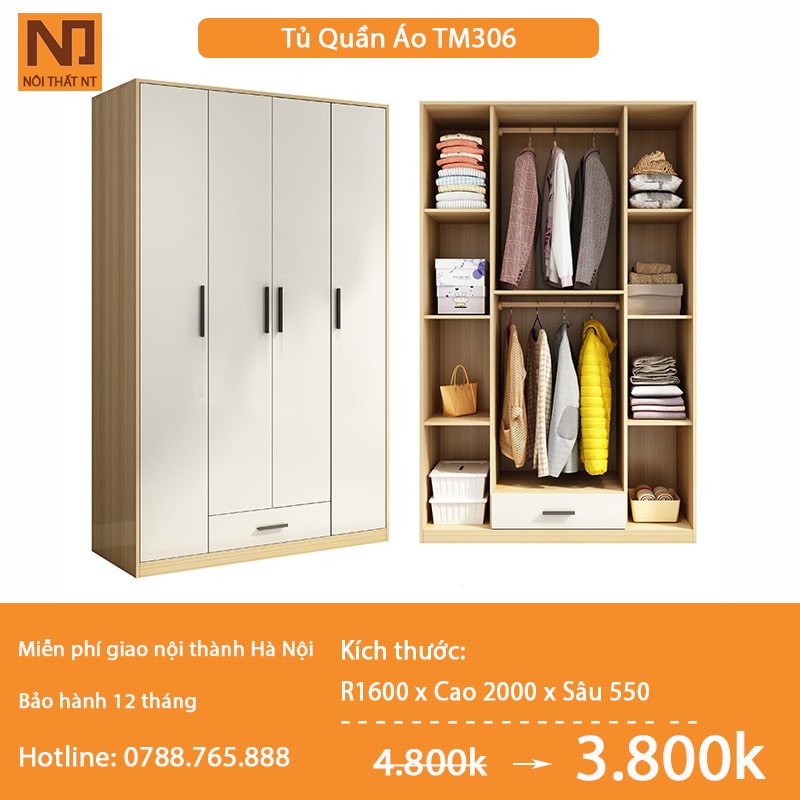 Tủ quần áo gần như là sản phẩm không thể thiếu đối với mỗi người. Nó giúp không gian sống của bạn gọn gàng hơn, là nơi cất giữ những bộ trang phục đẹp đẽ của bạn. Hiện nay trên thị trường có rất nhiều tủ quần áo mẫu mã, chất liệu khác nhau. Nếu bạn còn đang tìm kiếm địa chỉ sản xuất, thiết kế tủ quần áo nào ở Hà Nội uy tín thì hãy tham khảo các mẫu tủ quần áo đẹp gỗ công nghiệp của Đồ gỗ nội thất NT nhé, chúng tôi tin là bạn sẽ hài lòng. Cùng xem mẫu tủ quần áo hiện đại TM306 nhé.
