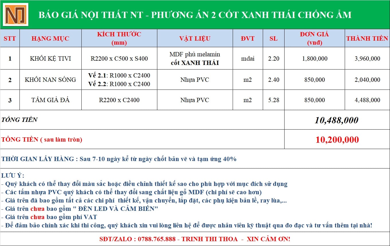 Sau khi thực hiện ốp vách kệ tivi xong, nhân viên Nội Thất NT tiến hành kiểm tra lại một lần nữa. Nếu không có sai xót gì, nhận thanh toán của khách hàng và tư vấn về chính sách bảo hành nếu khách hàng yêu cầu.
