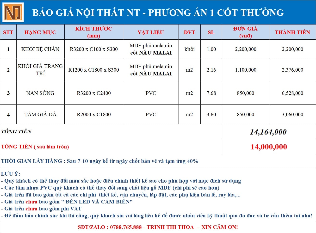Sau khi thực hiện ốp vách kệ tivi xong, nhân viên Nội Thất NT tiến hành kiểm tra lại một lần nữa. Nếu không có sai xót gì, nhận thanh toán của khách hàng và tư vấn về chính sách bảo hành nếu khách hàng yêu cầu.
