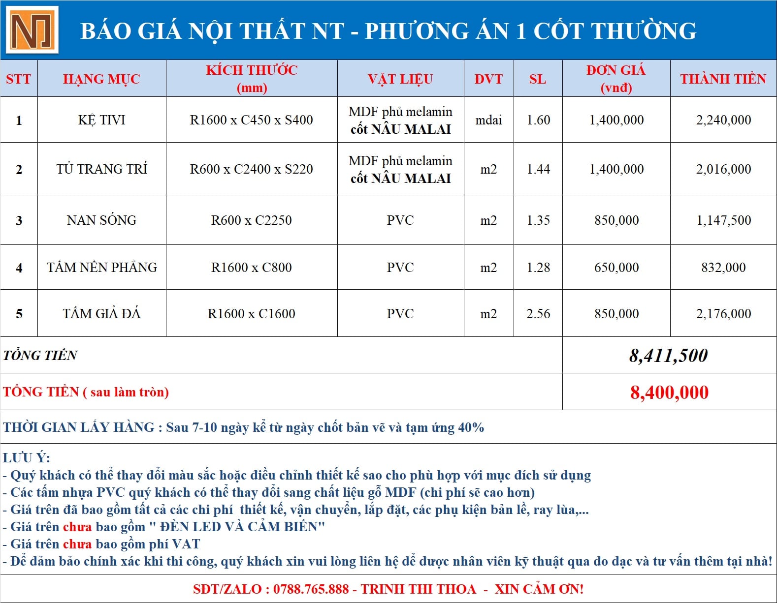 Sau khi thực hiện ốp vách kệ tivi xong, nhân viên Nội Thất NT tiến hành kiểm tra lại một lần nữa. Nếu không có sai xót gì, nhận thanh toán của khách hàng và tư vấn về chính sách bảo hành nếu khách hàng yêu cầu.