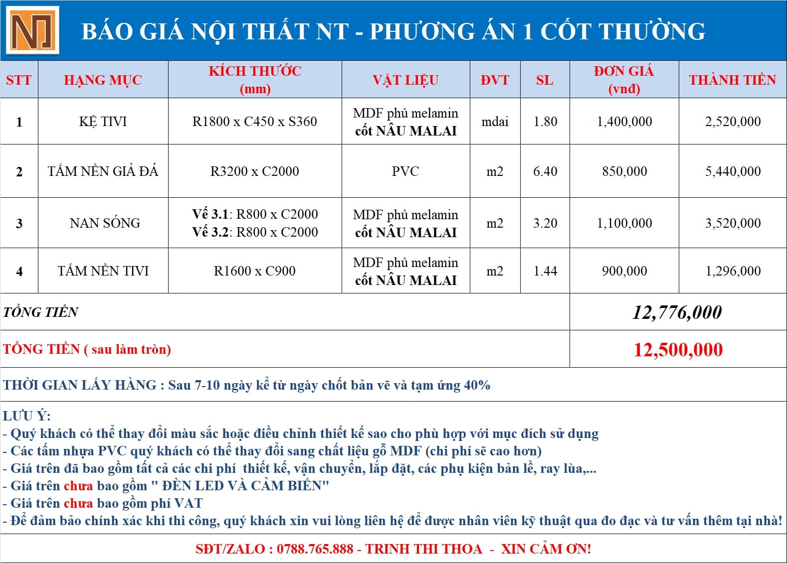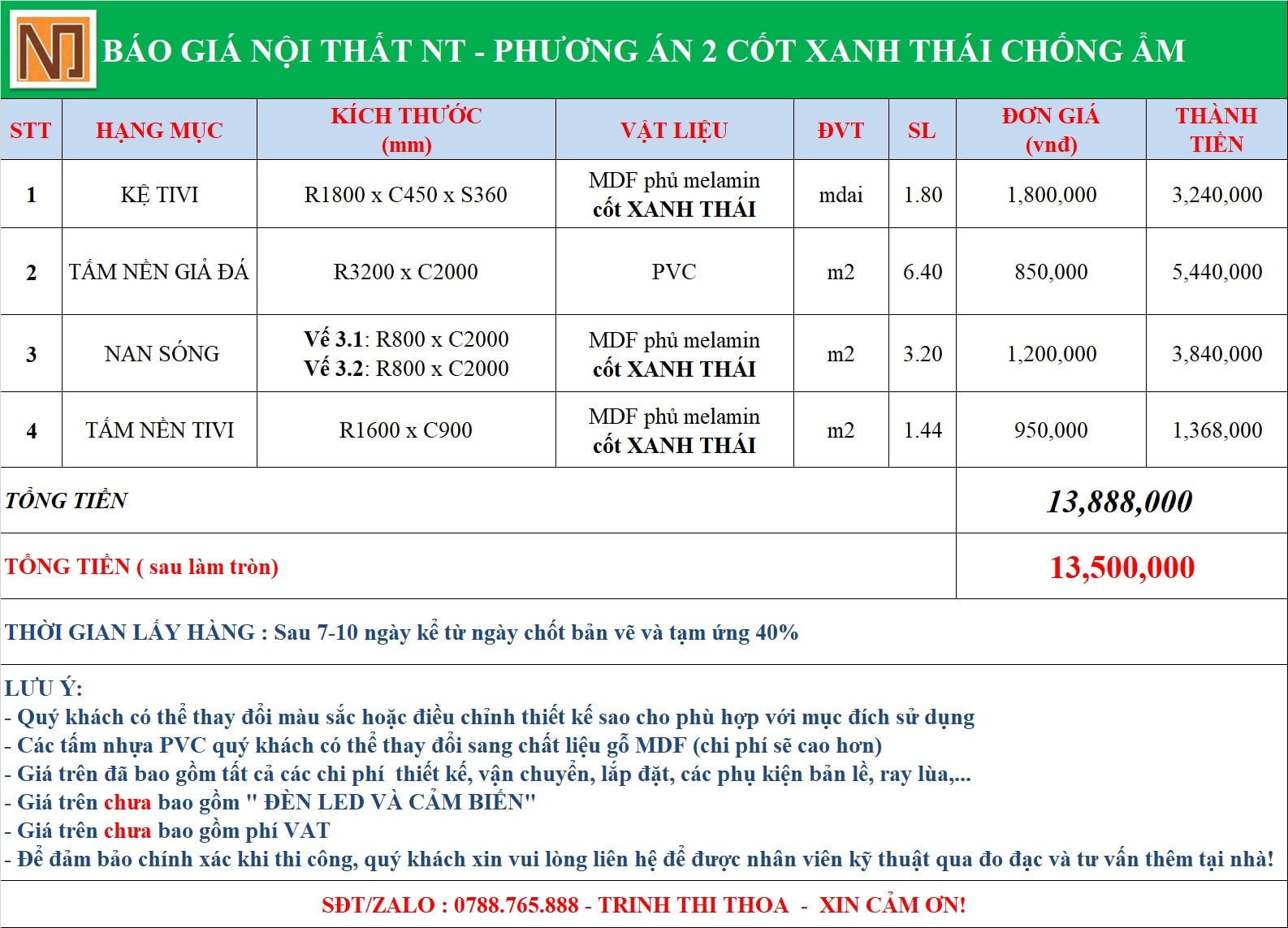 Sau khi thực hiện ốp vách kệ tivi xong, nhân viên Nội Thất NT tiến hành kiểm tra lại một lần nữa. Nếu không có sai xót gì, nhận thanh toán của khách hàng và tư vấn về chính sách bảo hành nếu khách hàng yêu cầu.