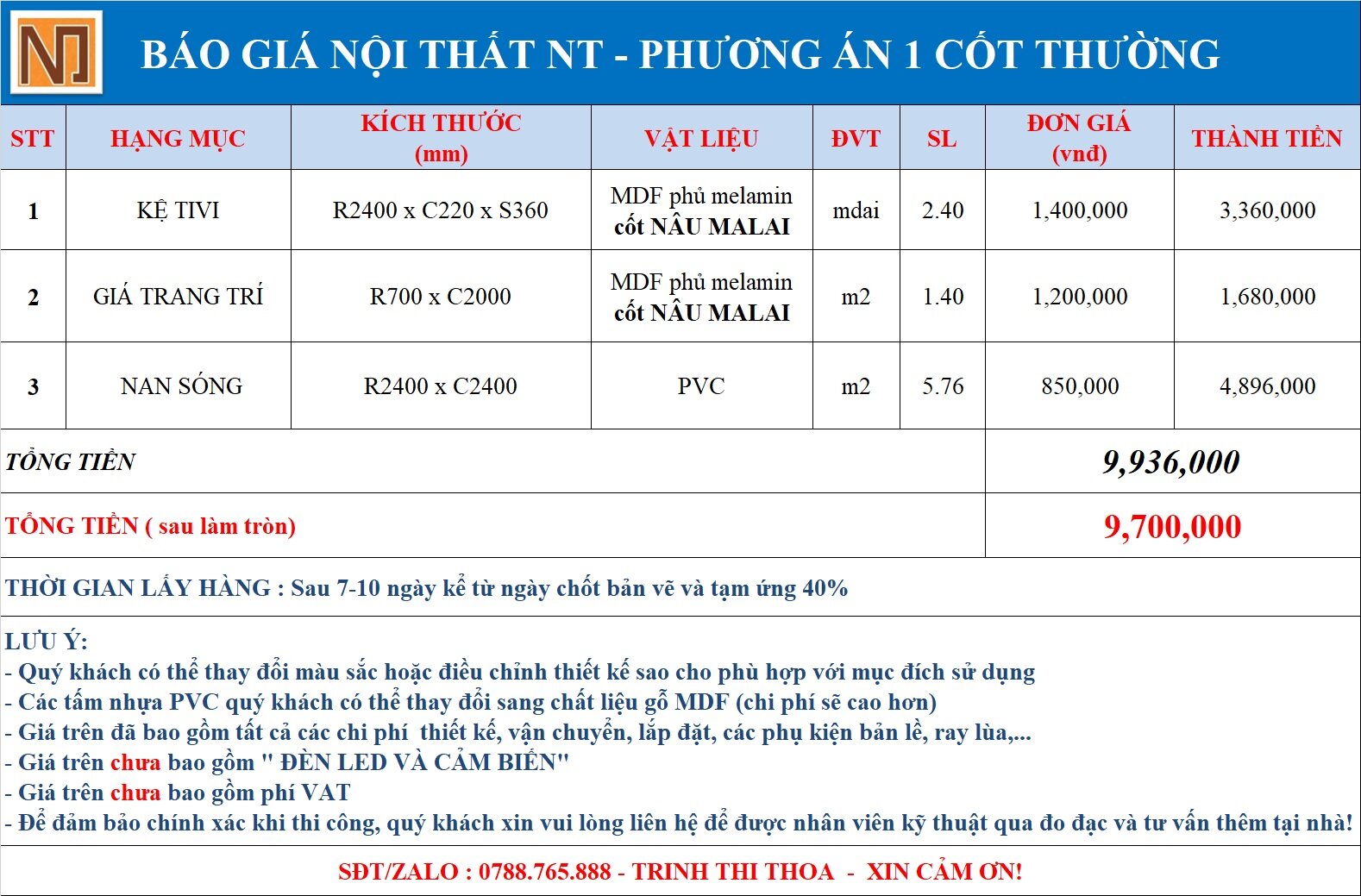 Sau khi thực hiện ốp vách kệ tivi xong, nhân viên Nội Thất NT tiến hành kiểm tra lại một lần nữa. Nếu không có sai xót gì, nhận thanh toán của khách hàng và tư vấn về chính sách bảo hành nếu khách hàng yêu cầu.